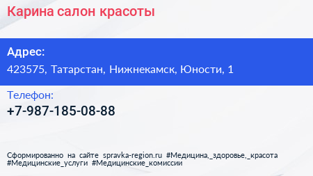 Карина, салон красоты по адресу 423575, Татарстан, Нижнекамск, Юности, 1 в дальнейшем Организация, размещена в следующих категориях: