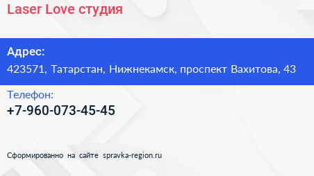 Laser Love, студия по адресу 423571, Татарстан, Нижнекамск, проспект Вахитова, 43 в дальнейшем Организация, размещена в следующих категориях: