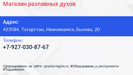 Магазин разливных духов по адресу 423584, Татарстан, Нижнекамск, Бызова, 20 в дальнейшем Организация, размещена в следующих категориях: