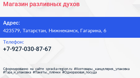 Магазин разливных духов по адресу 423579, Татарстан, Нижнекамск, Гагарина, 6 в дальнейшем Организация, размещена в следующих категориях: