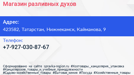 Магазин разливных духов по адресу 423582, Татарстан, Нижнекамск, Кайманова, 9 в дальнейшем Организация, размещена в следующих категориях: