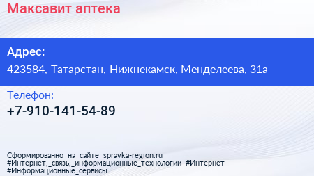 Максавит, аптека по адресу 423584, Татарстан, Нижнекамск, Менделеева, 31а в дальнейшем Организация, размещена в следующих категориях: