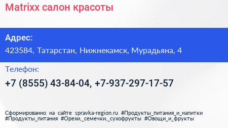 Matrixx, салон красоты по адресу 423584, Татарстан, Нижнекамск, Мурадьяна, 4 в дальнейшем Организация, размещена в следующих категориях: