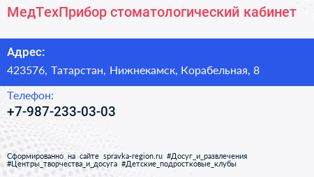 МедТехПрибор, стоматологический кабинет по адресу 423576, Татарстан, Нижнекамск, Корабельная, 8 в дальнейшем Организация, размещена в следующих категориях: