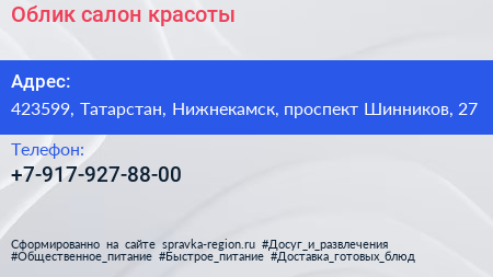 Облик, салон красоты по адресу 423599, Татарстан, Нижнекамск, проспект Шинников, 27 в дальнейшем Организация, размещена в следующих категориях: