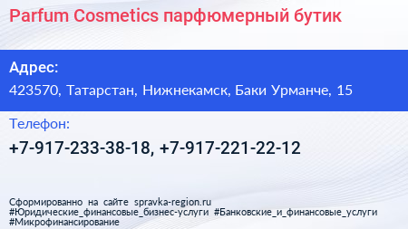 Parfum & Cosmetics, парфюмерный бутик по адресу 423570, Татарстан, Нижнекамск, Баки Урманче, 15 в дальнейшем Организация, размещена в следующих категориях: