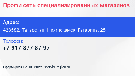 Профи, сеть специализированных магазинов по адресу 423582, Татарстан, Нижнекамск, Гагарина, 25 в дальнейшем Организация, размещена в следующих категориях: