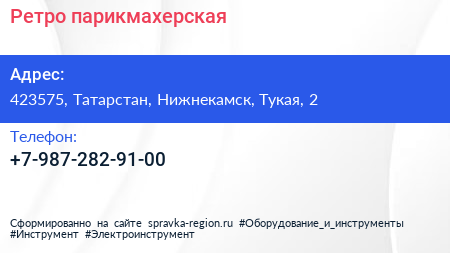 Ретро, парикмахерская по адресу 423575, Татарстан, Нижнекамск, Тукая, 2 в дальнейшем Организация, размещена в следующих категориях: