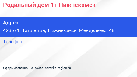 Родильный дом №1, г. Нижнекамск по адресу 423571, Татарстан, Нижнекамск, Менделеева, 48 в дальнейшем Организация, размещена в следующих категориях: