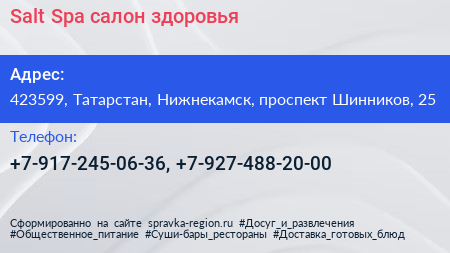 Salt & Spa, салон здоровья по адресу 423599, Татарстан, Нижнекамск, проспект Шинников, 25 в дальнейшем Организация, размещена в следующих категориях: