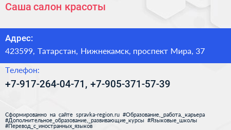 Саша, салон красоты по адресу 423599, Татарстан, Нижнекамск, проспект Мира, 37 в дальнейшем Организация, размещена в следующих категориях: