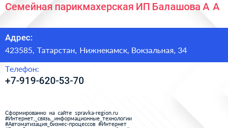 Семейная парикмахерская, ИП Балашова А.А. по адресу 423585, Татарстан, Нижнекамск, Вокзальная, 34 в дальнейшем Организация, размещена в следующих категориях: