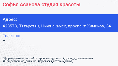 Софья Асанова, студия красоты по адресу 423578, Татарстан, Нижнекамск, проспект Химиков, 34 в дальнейшем Организация, размещена в следующих категориях: