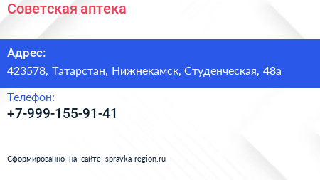 Советская аптека по адресу 423578, Татарстан, Нижнекамск, Студенческая, 48а в дальнейшем Организация, размещена в следующих категориях: