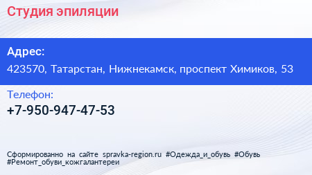 Студия эпиляции по адресу 423570, Татарстан, Нижнекамск, проспект Химиков, 53 в дальнейшем Организация, размещена в следующих категориях: