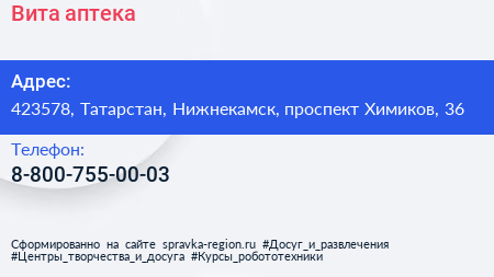 Вита, аптека по адресу 423578, Татарстан, Нижнекамск, проспект Химиков, 36 в дальнейшем Организация, размещена в следующих категориях: