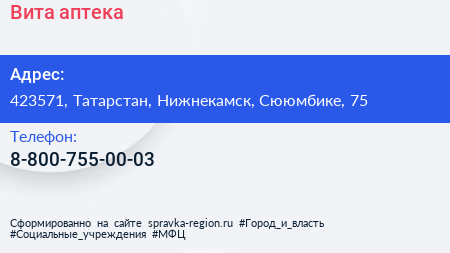 Вита, аптека по адресу 423571, Татарстан, Нижнекамск, Сююмбике, 75 в дальнейшем Организация, размещена в следующих категориях: