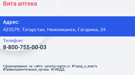 Вита, аптека по адресу 423579, Татарстан, Нижнекамск, Гагарина, 24 в дальнейшем Организация, размещена в следующих категориях:
