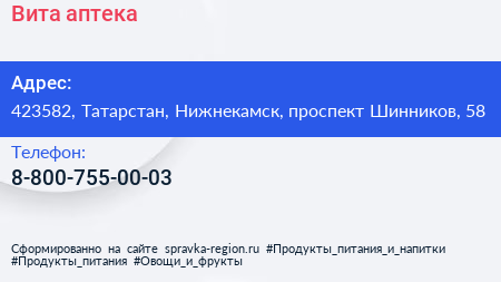Вита, аптека по адресу 423582, Татарстан, Нижнекамск, проспект Шинников, 58 в дальнейшем Организация, размещена в следующих категориях: