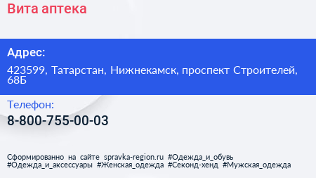 Вита, аптека по адресу 423599, Татарстан, Нижнекамск, проспект Строителей, 68Б в дальнейшем Организация, размещена в следующих категориях: