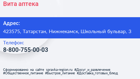 Вита, аптека по адресу 423575, Татарстан, Нижнекамск, Школьный бульвар, 3 в дальнейшем Организация, размещена в следующих категориях: