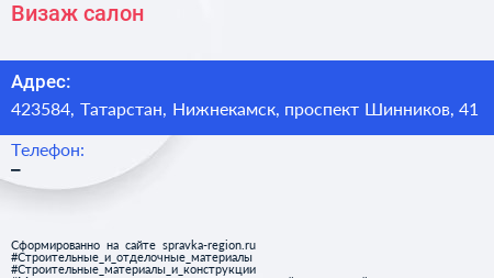 Визаж, салон по адресу 423584, Татарстан, Нижнекамск, проспект Шинников, 41 в дальнейшем Организация, размещена в следующих категориях:
