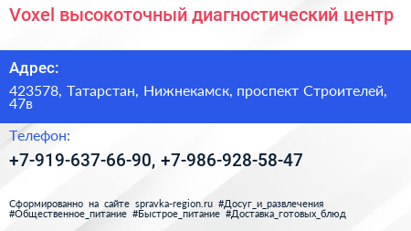 Voxel, высокоточный диагностический центр по адресу 423578, Татарстан, Нижнекамск, проспект Строителей, 47в в дальнейшем Организация, размещена в следующих категориях: