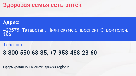 Здоровая семья, сеть аптек по адресу 423575, Татарстан, Нижнекамск, проспект Строителей, 18а в дальнейшем Организация, размещена в следующих категориях: