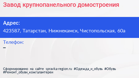 Завод крупнопанельного домостроения по адресу 423587, Татарстан, Нижнекамск, Чистопольская, 60а в дальнейшем Организация, размещена в следующих категориях: