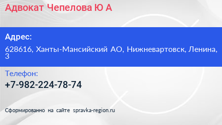 Адвокат Чепелова Ю.А. по адресу 628616, Ханты-Мансийский АО, Нижневартовск, Ленина, 3 в дальнейшем Организация, размещена в следующих категориях: