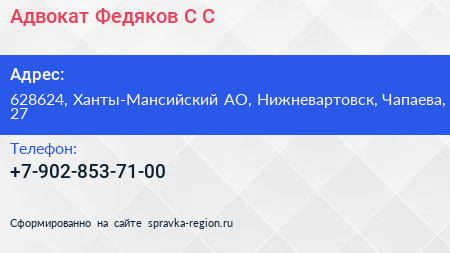 Адвокат Федяков С.С. по адресу 628624, Ханты-Мансийский АО, Нижневартовск, Чапаева, 27 в дальнейшем Организация, размещена в следующих категориях: