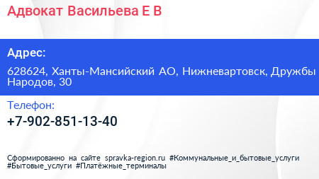 Адвокат Васильева Е.В. по адресу 628624, Ханты-Мансийский АО, Нижневартовск, Дружбы Народов, 30 в дальнейшем Организация, размещена в следующих категориях: