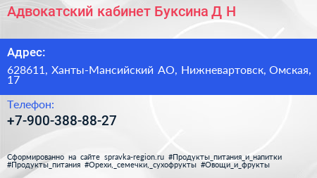 Адвокатский кабинет Буксина Д.Н. по адресу 628611, Ханты-Мансийский АО, Нижневартовск, Омская, 17 в дальнейшем Организация, размещена в следующих категориях: