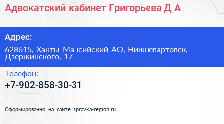 Адвокатский кабинет Григорьева Д.А. по адресу 628615, Ханты-Мансийский АО, Нижневартовск, Дзержинского, 17 в дальнейшем Организация, размещена в следующих категориях:
