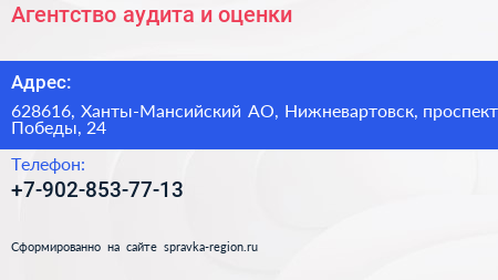 Агентство аудита и оценки по адресу 628616, Ханты-Мансийский АО, Нижневартовск, проспект Победы, 24 в дальнейшем Организация, размещена в следующих категориях: