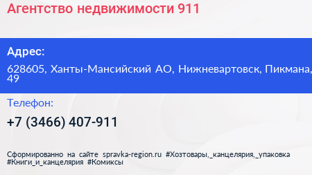 Агентство недвижимости 911 по адресу 628605, Ханты-Мансийский АО, Нижневартовск, Пикмана, 49 в дальнейшем Организация, размещена в следующих категориях: