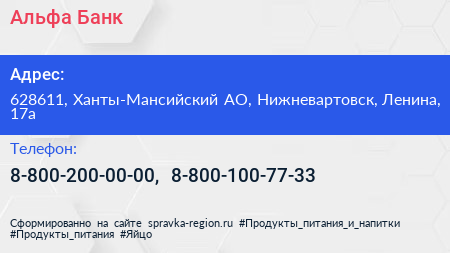 Альфа-Банк по адресу 628611, Ханты-Мансийский АО, Нижневартовск, Ленина, 17а в дальнейшем Организация, размещена в следующих категориях: