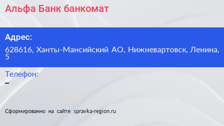Альфа-Банк, банкомат по адресу 628616, Ханты-Мансийский АО, Нижневартовск, Ленина, 5 в дальнейшем Организация, размещена в следующих категориях:
