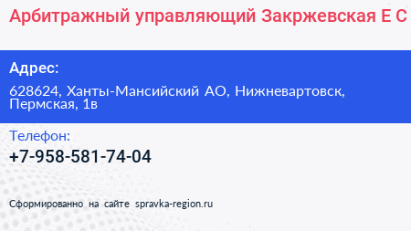 Арбитражный управляющий Закржевская Е.С. по адресу 628624, Ханты-Мансийский АО, Нижневартовск, Пермская, 1в в дальнейшем Организация, размещена в следующих категориях: