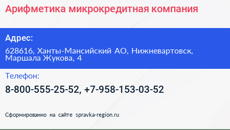 Арифметика, микрокредитная компания по адресу 628616, Ханты-Мансийский АО, Нижневартовск, Маршала Жукова, 4 в дальнейшем Организация, размещена в следующих категориях: