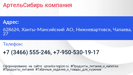 АртельСибирь, компания по адресу 628624, Ханты-Мансийский АО, Нижневартовск, Чапаева, 27 в дальнейшем Организация, размещена в следующих категориях:
