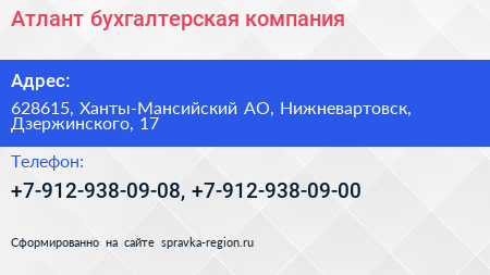 Атлант, бухгалтерская компания по адресу 628615, Ханты-Мансийский АО, Нижневартовск, Дзержинского, 17 в дальнейшем Организация, размещена в следующих категориях: