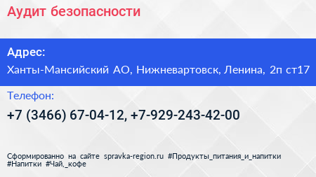 Аудит безопасности по адресу Ханты-Мансийский АО, Нижневартовск, Ленина, 2п ст17 в дальнейшем Организация, размещена в следующих категориях: