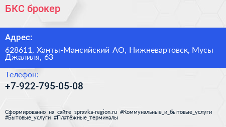 БКС брокер по адресу 628611, Ханты-Мансийский АО, Нижневартовск, Мусы Джалиля, 63 в дальнейшем Организация, размещена в следующих категориях: