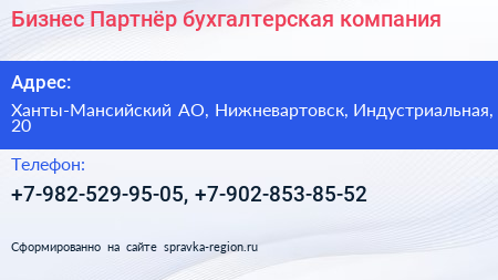 Бизнес-Партнёр, бухгалтерская компания по адресу Ханты-Мансийский АО, Нижневартовск, Индустриальная, 20 в дальнейшем Организация, размещена в следующих категориях: