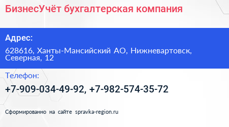БизнесУчёт, бухгалтерская компания по адресу 628616, Ханты-Мансийский АО, Нижневартовск, Северная, 12 в дальнейшем Организация, размещена в следующих категориях: