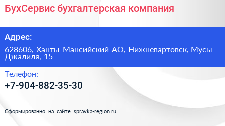 БухСервис, бухгалтерская компания по адресу 628606, Ханты-Мансийский АО, Нижневартовск, Мусы Джалиля, 15 в дальнейшем Организация, размещена в следующих категориях: