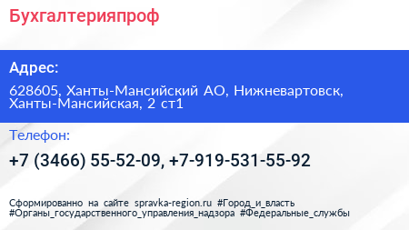 Бухгалтерияпроф по адресу 628605, Ханты-Мансийский АО, Нижневартовск, Ханты-Мансийская, 2 ст1 в дальнейшем Организация, размещена в следующих категориях: