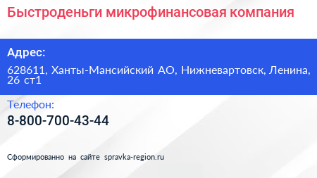 Быстроденьги, микрофинансовая компания по адресу 628611, Ханты-Мансийский АО, Нижневартовск, Ленина, 26 ст1 в дальнейшем Организация, размещена в следующих категориях:
