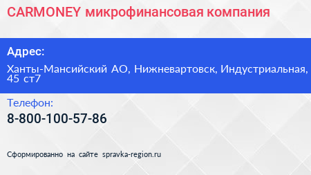 CARMONEY, микрофинансовая компания по адресу Ханты-Мансийский АО, Нижневартовск, Индустриальная, 45 ст7 в дальнейшем Организация, размещена в следующих категориях: